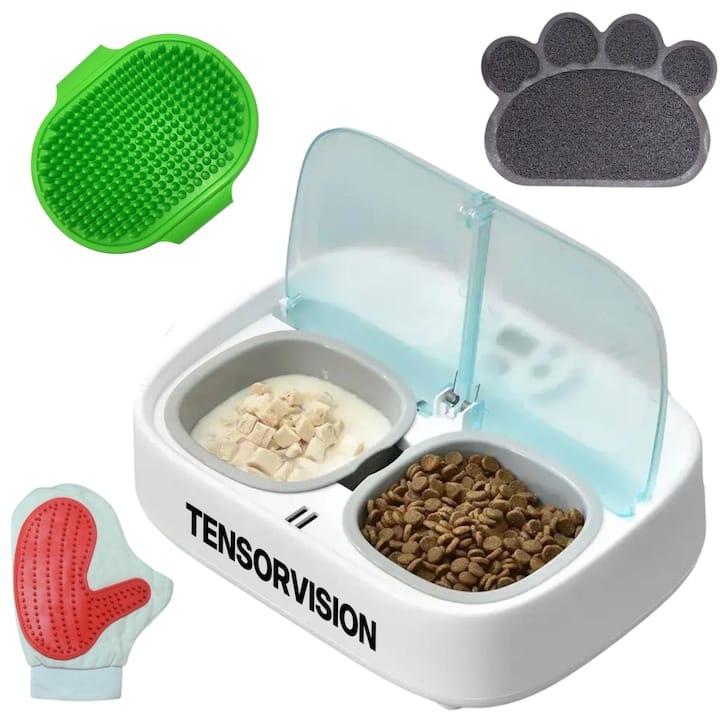 Tensorvision e mai degrabă un set complet de îngrijire decât doar un hrănitor. Are două boluri mici, potrivite pentru animale de talie mică sau pentru pisici, și se conectează la aplicația Tuya pentru programarea meselor.