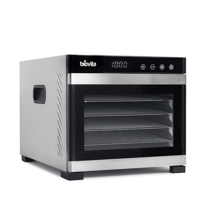 Biovita Deluxe 6 vine cu o carcasă și tăvi complet din inox, ceea ce e un mare plus pentru cei care vor un aparat robust, ușor de curățat și sigur în contact cu alimentele. Cele 6 tăvi oferă spațiu mai mult decât decent, iar distribuția aerului este uniformă, fără să fie nevoie să le schimbi între ele.