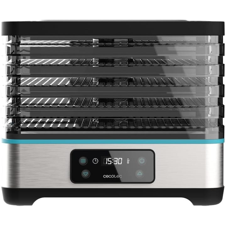 Un model interesant prin combinația dintre funcționalitate digitală și design compact. Cecotec VitaDry Pro vine cu 5 tăvi modulabile, pe care le poți ajusta în înălțime, un detaliu foarte practic dacă vrei să usuci și felii mai groase sau fructe întregi.