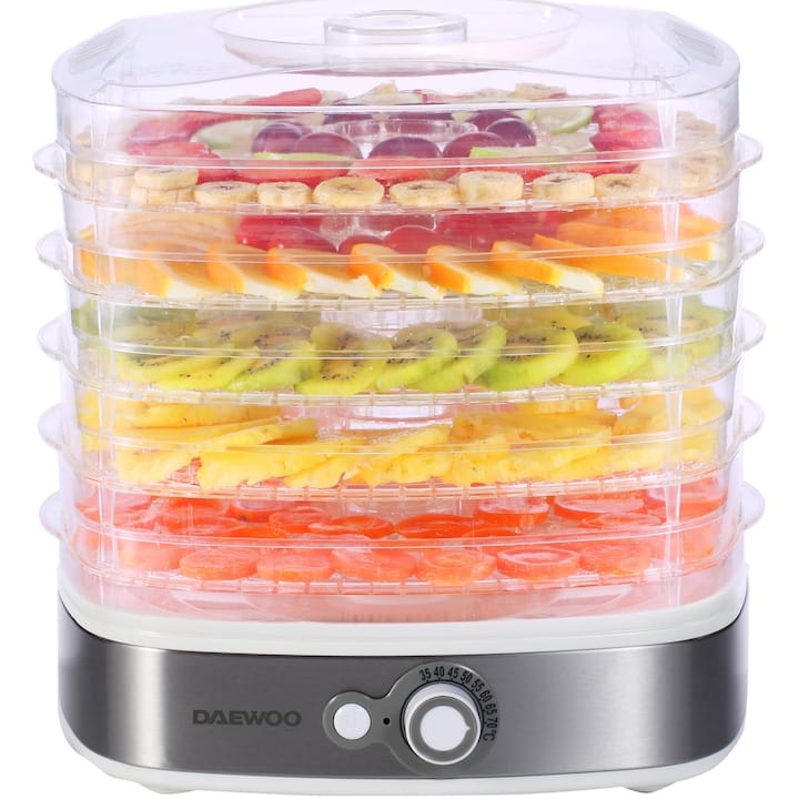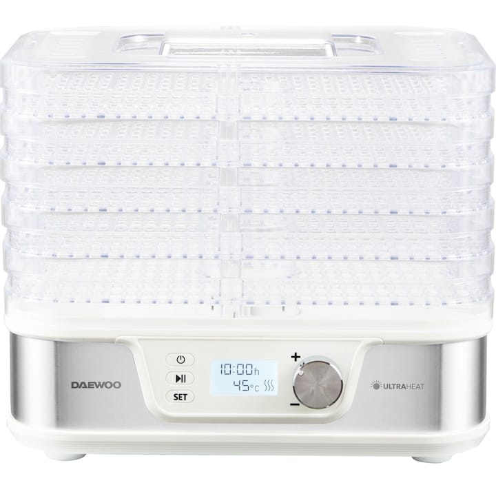 Un model cu aspect clasic, dar surprinzător de eficient pentru categoria lui de preț. Daewoo DD450W vine cu 5 tăvi, un sistem de ventilație decent și un panou de control mecanic foarte simplu. Ideal pentru cei care nu vor bătăi de cap cu meniuri digitale, dar vor să experimenteze cu deshidratarea fructelor sau legumelor în mod constant.