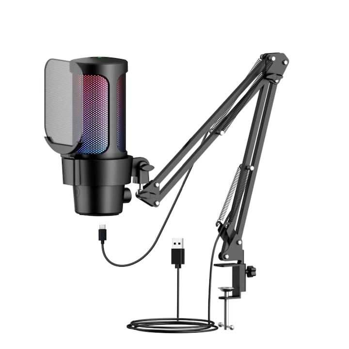 - Sub 200 lei – Te poți aștepta la microfoane USB condenser simple, cu filtrare cardioid de bază, iluminare RGB fixă și funcții tap-to-mute. Ideal pentru streaming ocazional, call-uri și vlogging.