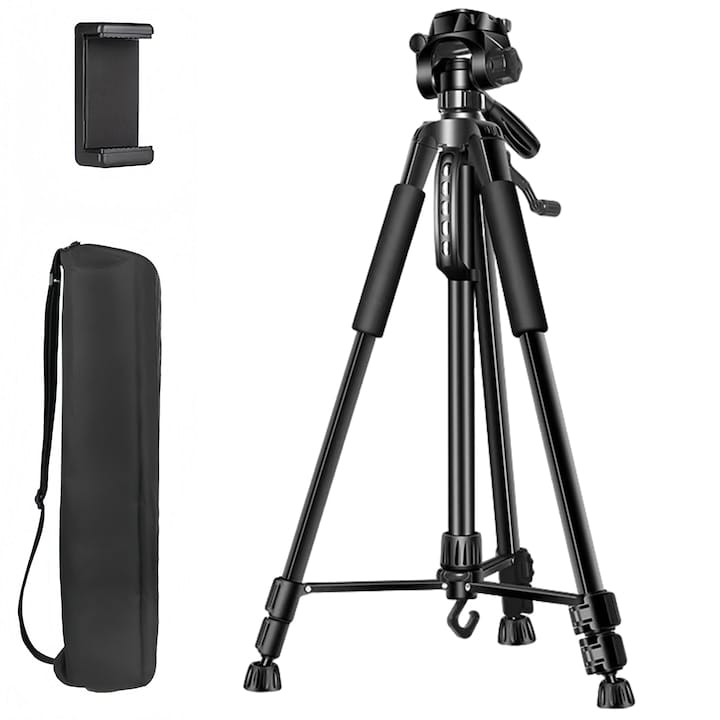 Presoma e un trepied micuț, dar isteț, gândit mai ales pentru filmări cu telefonul în spații interioare. Poate nu impresionează la prima vedere, dar e foarte comod de folosit pentru cadre rapide, live-uri, selfie-uri sau TikTok-uri în casă.
