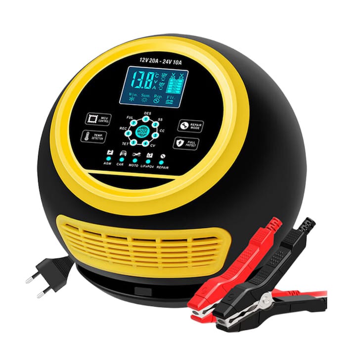 Un redresor auto pe care îl bagi la treabă fără complicații: suport 12V și 24V, curent suficient pentru multe baterii auto și utilitare și afișaj LCD care arată tensiunea și etapa de încărcare. Este mai simplu decât modelele inteligente, dar eficient dacă vrei ceva de „plug & play”.