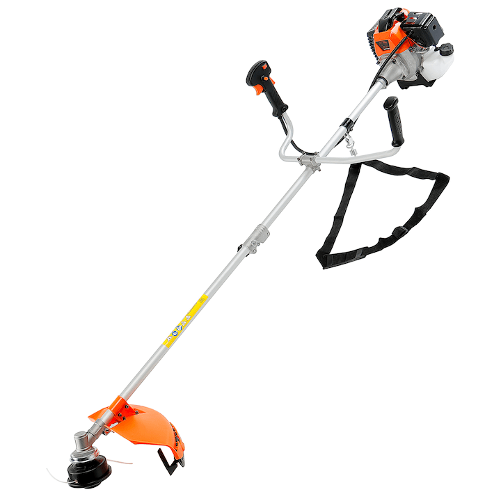 Acest model este o alegere echilibrată pentru uzul gospodăresc: motor pe benzină, 2 timpi, capabil să facă faţă tăierii ierbii sau buruienilor mai serioase, fără să coste o avere.