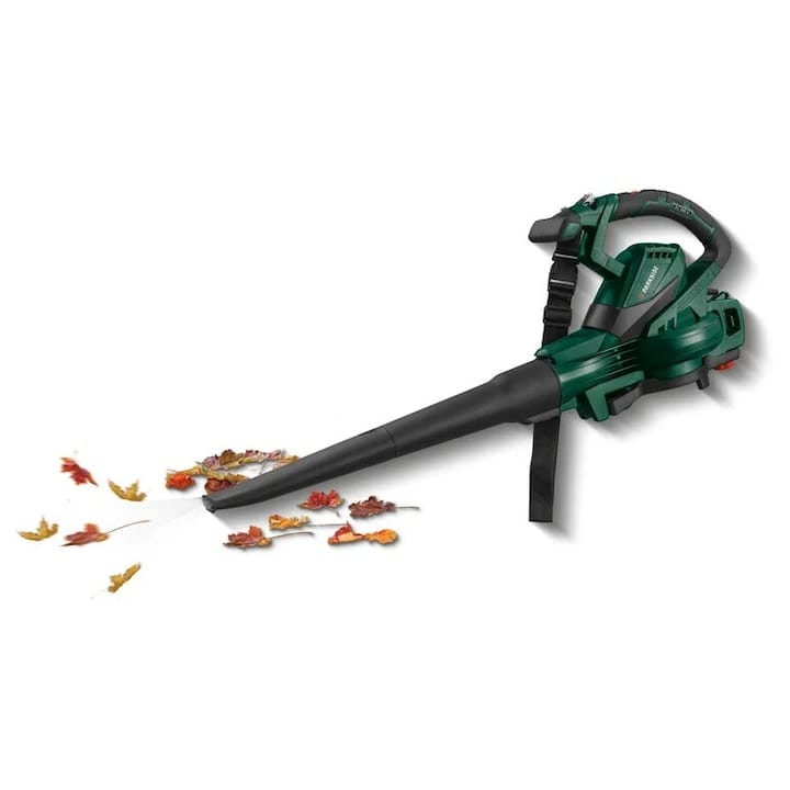 Parkside 3000W este varianta clasică, cu fir, pentru cei care vor o suflantă-aspirator capabilă să facă față la sesiuni lungi de curățenie. Modelul e echipat cu sac colector și curea de umăr, iar puterea de 3000W îl face potrivit inclusiv pentru grădini cu mulți copaci.