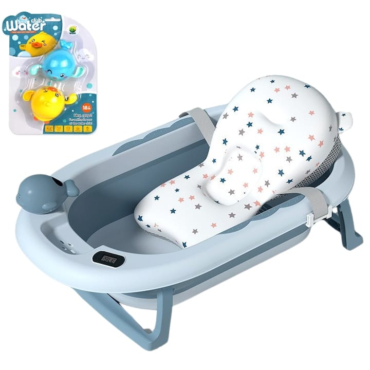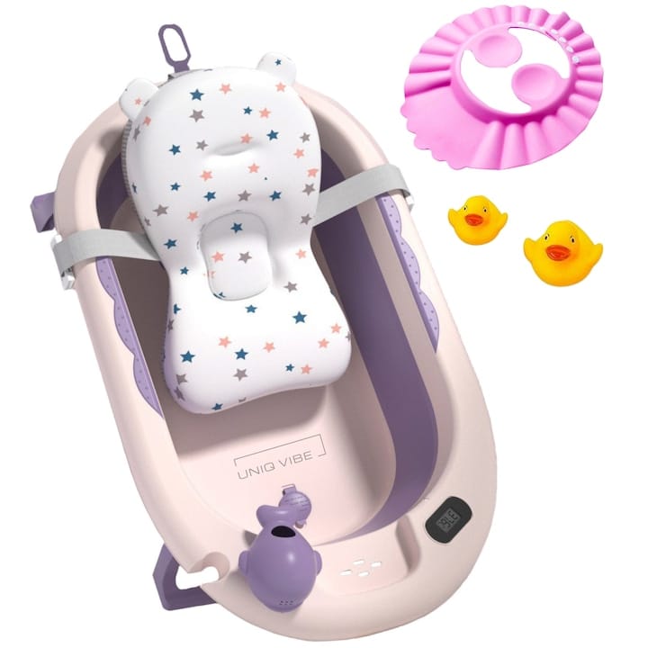 Dacă vrei să faci baia un moment cât mai distractiv și relaxant, UniqVibe vine cu tot „arsenalul”: pernuță moale, jucării, termometru digital și detalii pe care le apreciezi de la primele băi. E ideală pentru părinții care vor să fie siguri că apa are temperatura perfectă și că bebelușul stă confortabil.