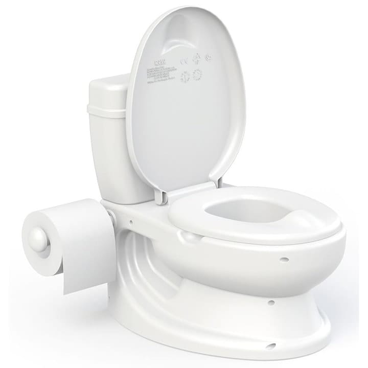 Cu Dolu, totul e gândit să facă tranziția cât mai lină – pentru copil, dar și pentru părinți. Imitația de toaletă reală, cu buton care face sunet de apă și capac rabatabil, chiar ajută la acomodare, iar vasul detașabil se curăță ușor.
