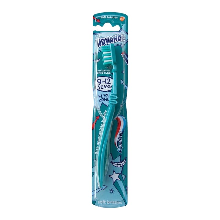 Aquafresh Advance Soft este destinată copiilor aflați la granița dintre dinții de lapte și cei permanenți. Perii săi cu lungimi diferite curăță eficient între dinți, iar mânerul ergonomic cu zone moi asigură o prindere stabilă și confortabilă.