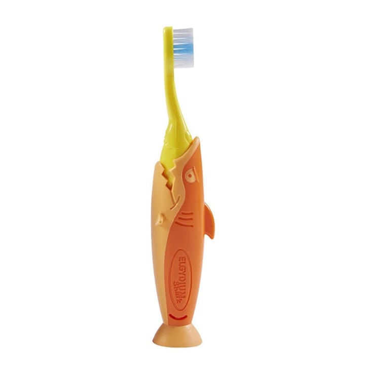 | Elgydium (Kids Shark) | 2-6 | Moale | Design jucăuș Shark, cap mic, mâner lat | Nu | Atrage copiii prin design, dar curăță eficient |