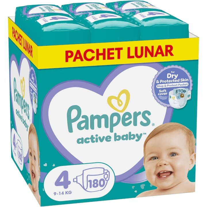 | Pampers (Active Baby XXL Box, mărimea 4) | 9-14 | 180 | Protecție 3-way comfort | Da | Absorbție instant |