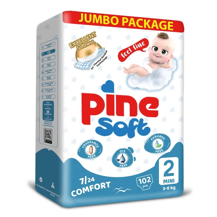 Pine Soft Mini Jumbo se adresează părinților care caută o variantă economică, dar totuși sigură. Formulă fără parabeni sau parfum, cu bumbac moale și bariere anti-scurgere, scutecul este adaptat pentru pielea sensibilă a celor mai mici.
