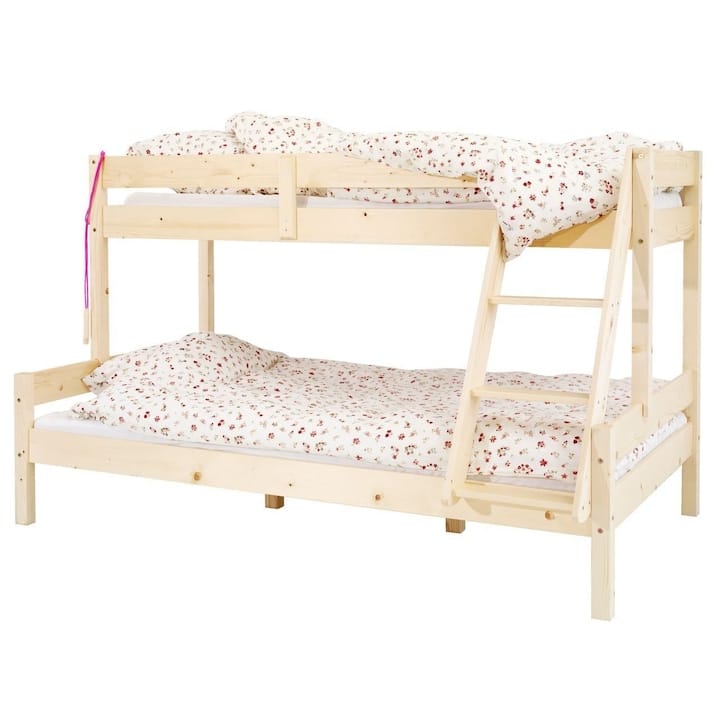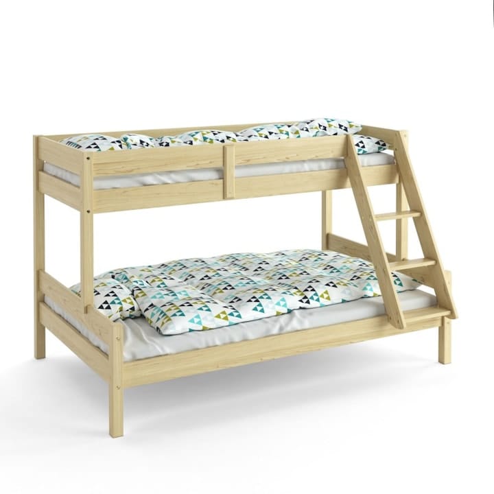 Acest model este pentru familiile care chiar au nevoie de spațiu și eficiență. Suportă trei copii, are structură din lemn și ocupă ceva mai mult loc, dar îți rezolvă dintr-un foc problema paturilor. Nu vine cu sertare, însă fiecare nivel e bine delimitat și scara este accesibilă.