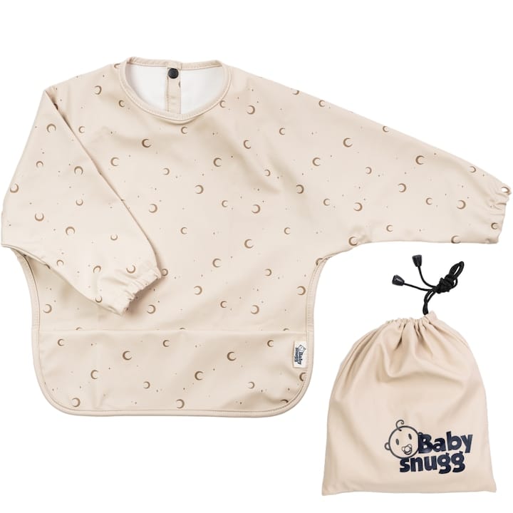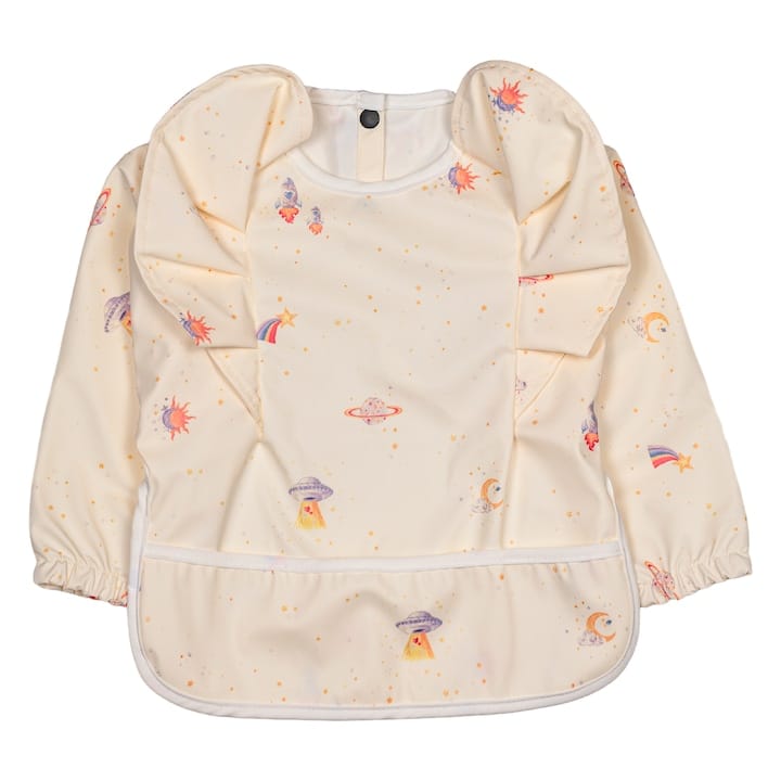 Dacă cel mic vrea să picteze cu piureul, genul acesta de bavetă cu mâneci lungi și buzunar colector adună tot ce cade, inclusiv „accidentele” de pe mâneci. Materialul e ușor, respirabil și nu lasă umezeala să treacă, iar prinderea cu capse la spate o face greu de scos de către copii.