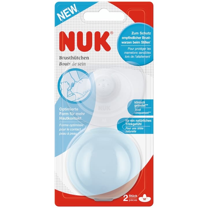 Produs cu tradiție, apreciat pentru materialul subțire și pentru forma care imită sânul mamei. NUK a pus accent pe confort, astfel încât bebelușul să poată „lucra” cu ușurință cu protecția, chiar și în cazuri dificile, supt slab, mameloane plate sau atașare dificilă.