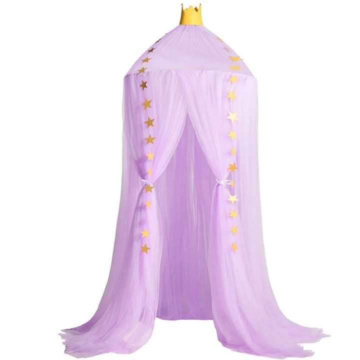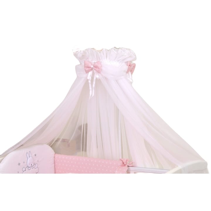 Un model spectaculos prin lungime și detaliile simpatice: fundiță și steluțe aplicate, potrivit pentru părinții care vor ca pătuțul să arate de poveste. Datorită suportului, poate fi montat ușor pe aproape orice tip de pătuț.