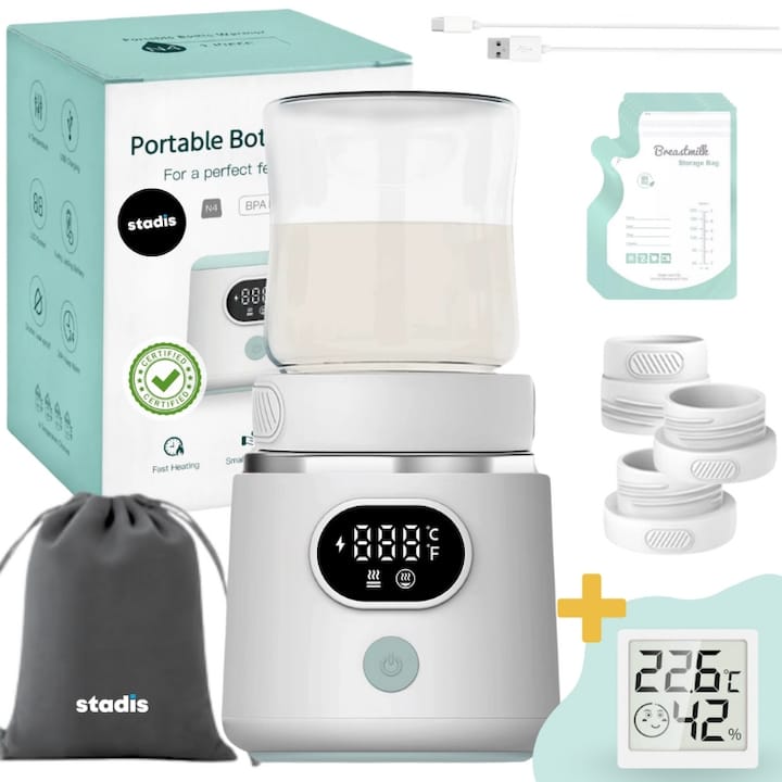 Încălzitor portabil și sterilizator cu funcție dublă, ideal pentru părinții mereu în mișcare și preocupați de autonomie.