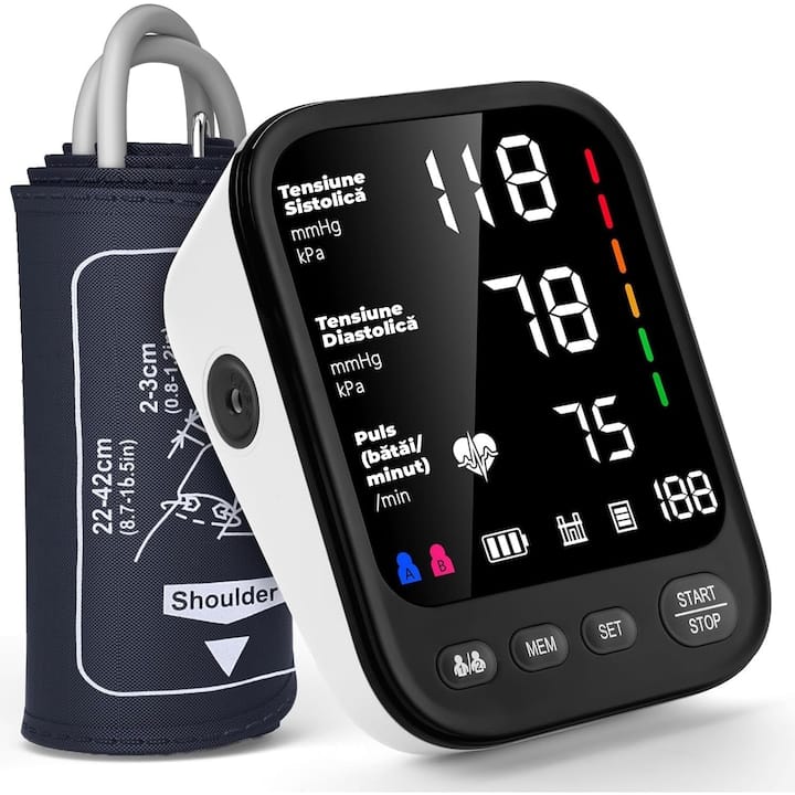 Un tensiometru digital de braţ potrivit pentru uz casnic, care aduce un ecran generos de 11,5 cm iluminat, mansetă reglabilă largă şi funcţii utile precum detector de aritmie şi hipertensiune. Ideal dacă vrei ceva simplu, dar cu câteva extra‑opţiuni.