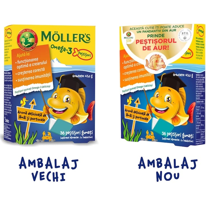 | Moller’s (Omega 3) | Jeleuri | 36 bucăți | Omega 3, vit. D, E, A | 3+ ani | Jeleuri |