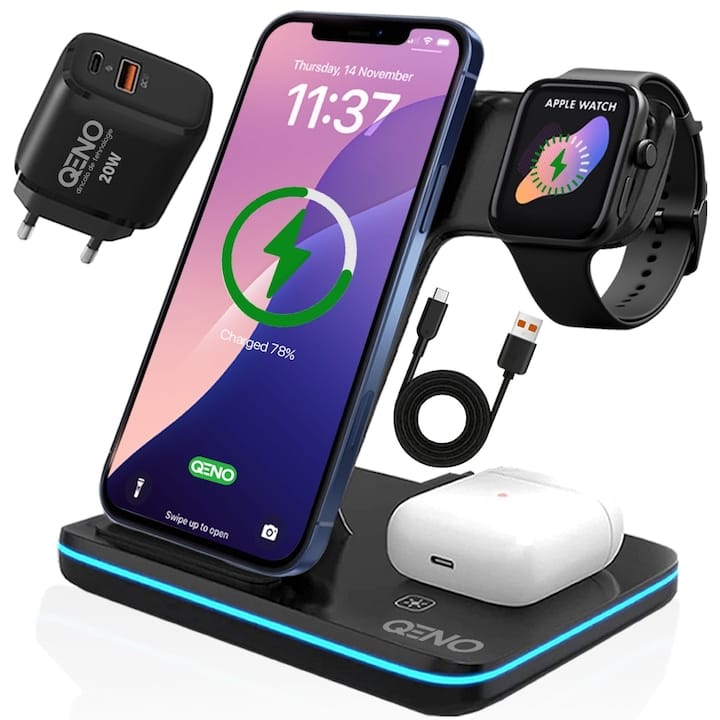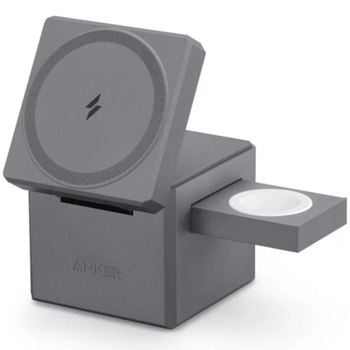 O soluție all-in-one pentru utilizatorii Apple, acest încărcător permite încărcarea simultană a iPhone-ului, Apple Watch-ului și AirPods-urilor, eliminând nevoia mai multor cabluri.